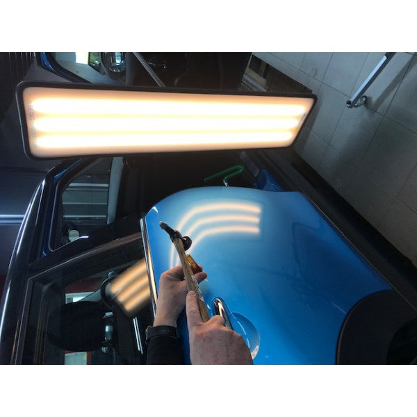 MotionLed Lamp is an adjustable LED lamp on wheels. The lamp shows more visible images to PDR technicians, insurance companies and customers.