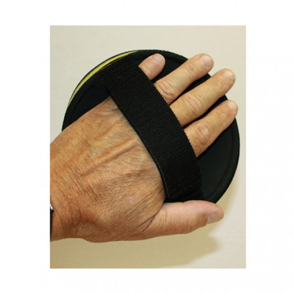 Soft holder for scrub pads with adjustable Velcro fastener.