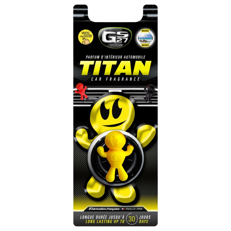 Titan monoi doft clip-on luftfräschare : Formuleringen "Titanium" har alltid varit en integrerad del av märkets exklusiva produkter. Det är för att illustrera denna förträfflighet som GS27 föreställde sig TITAN, som har blivit den officiella maskoten. Upptäck trevliga, originella dofter som alltid är 100 % franska. Njut av den exotiska doften av Monoï, doften av öarna! Upptäck även de andra dofterna i TITAN-familjen, som Aloe Vera, Lagon, Dark Sensation, Fraicheur Polar, Cerise, Méditerranée...