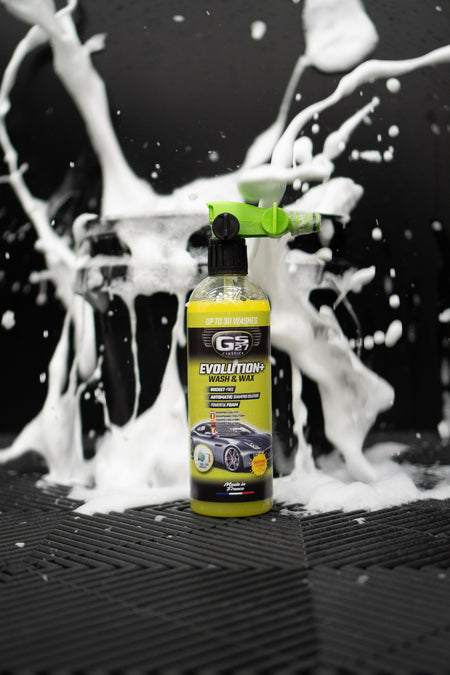 GS27® Paris Evolution+ Wash & Wax är unik med sin egen specifika spruta. Du kan faktiskt ansluta Evolution + Wash & Wax direkt till vattenförsörjningen. Ingen mer hink behövs. Spädningen doseras automatiskt genom slangändsprutan. Det är verkligen praktiskt och lätt att använda: spraya bara direkt på din bil. Dess rika skum är ultraavfettande och lämnar en glänsande finish. Dessutom gör dess grapefruktdoft den trevlig att använda. Med en flaska räcker du till cirka 15 användningar.