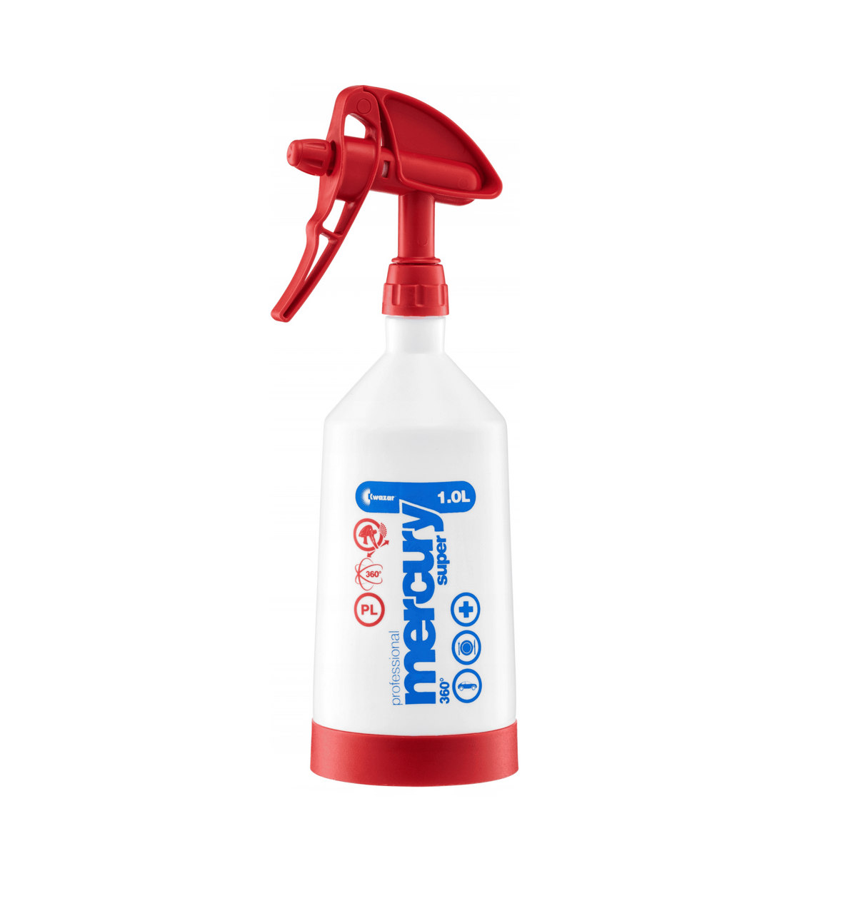 Kwazar tillverkar sprayflaskor och trycksprutor av högsta kvalitet, avsedda för den professionella marknaden. Mercury Super 360 Pro är en fantastisk flaska för de flesta kemikalier. Den har ett ställbart munstycker, stabil botten och fungerar även att använda upp och ner. För starkare syror, alkalier eller lösningsmedel, använd istället Kwazars specialflaskor för dessa typer av kemikalier.