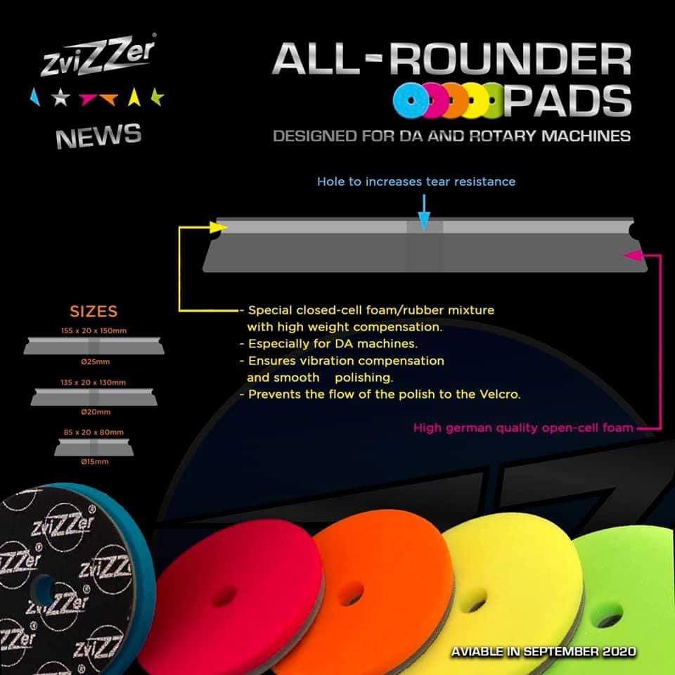 De nya All-Rounder-Pads är gjorda för användning med både roterande och Dual action Polermaskin. De består av två separata lager, Zvizzer open cell svamp för att poler ytan medan det inre lagret är gjort av en speciell typ av skum/gummi. Detta gör polerrondell säkerställer utmärkt fördelning av trycket på skummets arbetsyta. Minskar vibrationer, förbättrar DA-rotationen på grund av viktfördelning mot bakplattan och förhindrar penetrering av polish till kardborre. Det centrala hålet minskar värmeuppbyggnaden som oftast uppstår i mitten och deformerar svampen. Svampens arbetsyta är trapetsformad, vilket minskar stressen vid arbete med dual action polermaskin. Toppmodern pad teknologi. Allround-poleringsspads fungerar utmärkt på både roterande och dual action polermaskiner, vilket gör dem till ett självklart val om du har flera typer av polermaskiner. Zvizzer All-Rounder-pads kommer att göra ett fantastiskt jobb. Minskad vibration, bättre tryckfördelning, bättre hållbarhet och kan användas på båda roterande och dual action polermaskiner.