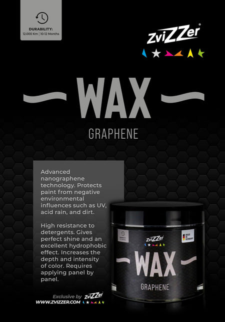 ZviZZer Wax Graphene 200ml – grafenvax Avancerad nanografenteknologi skyddar lacken mot negativa effekter av väderförhållanden, såsom UV-strålning, surt regn eller smuts. Produkt med hög kemikalieresistens. Wax Graphene ger en perfekt glans och en fantastisk hydrofob effekt. Det framhäver färgens djup och dess intensitet.